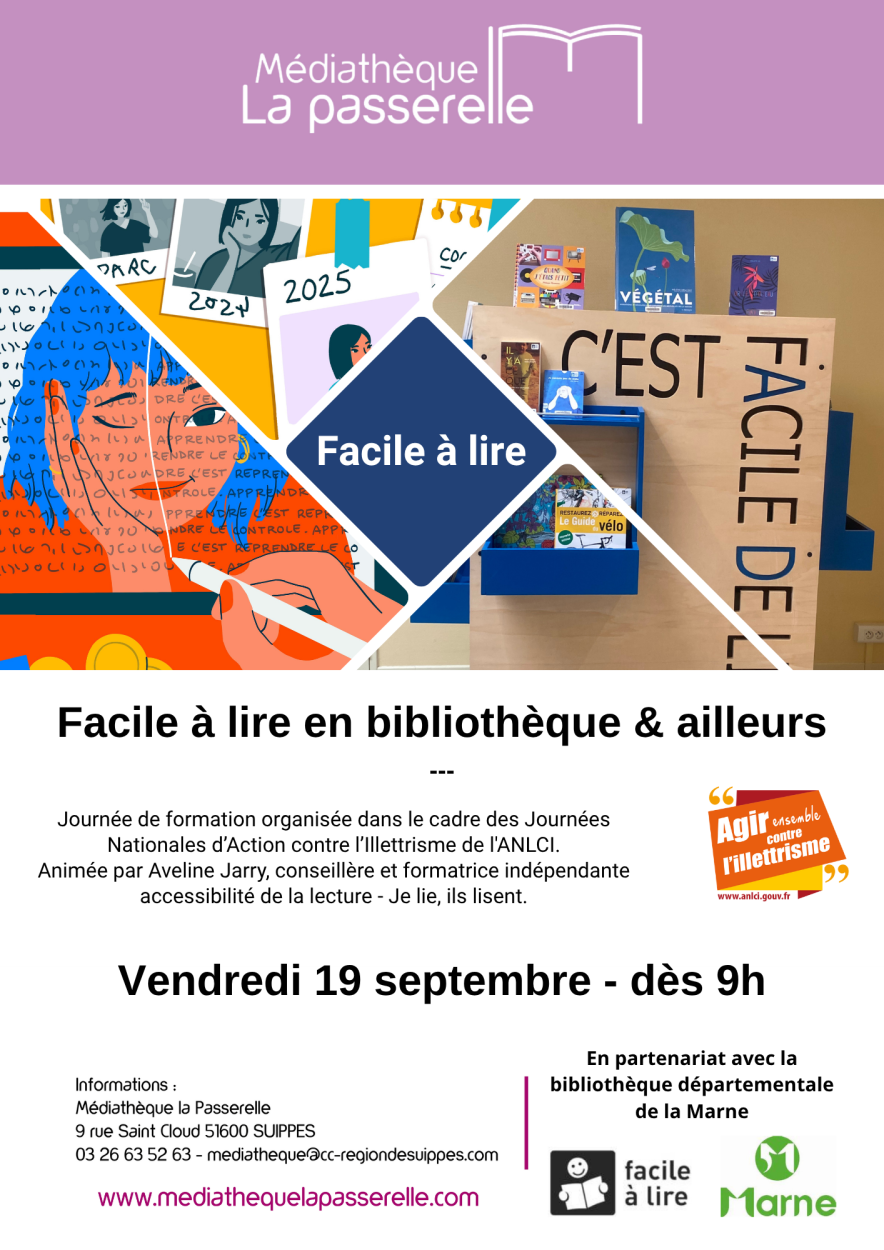 La médiathèque intercommunale de la Région de Suippes est heureuse d’inscrire dans ses projets le dispositif Facile à Lire. Cette formation permettra de mettre en place un espace Facile à lire, repérable et bien identifié, qui regroupe une offre de livres sélectionnés pour leur facilité d’accès, à tisser des partenariats et proposer des médiations pour faire vivre la sélection des livres.