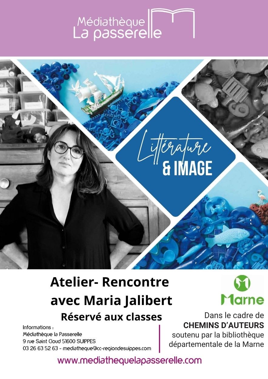 Atelier-Rencontre avec Maria Jalibert MédiathèqueMardi 7 Octobre / 9h30 - 10h30 Après des études aux Beaux-Arts de Toulouse, elle apprend les Métiers du Livre à Bordeaux, travaille un temps en librairie et publie son premier livre en 1999. C'est en rangeant la chambre de ses enfants pour la centième fois qu'elle a l'idée d'utiliser leurs jouets pour créer un album. Bric-à-Brac voit le jour en 2013 et sera suivi d'autres albums remplis de jouets. Depuis, c'est l'atelier de Maria qui est devenu un véritable bric-à-brac dans lequel elle continue néanmoins à créer, à découper, à photographier pour ses projets d'albums, d'illustrations, d'expositions ou d'affiches. Parfois, avec son panier rempli de jouets, elle sort de sa caverne multicolore et va rencontrer les enfants dans les écoles.