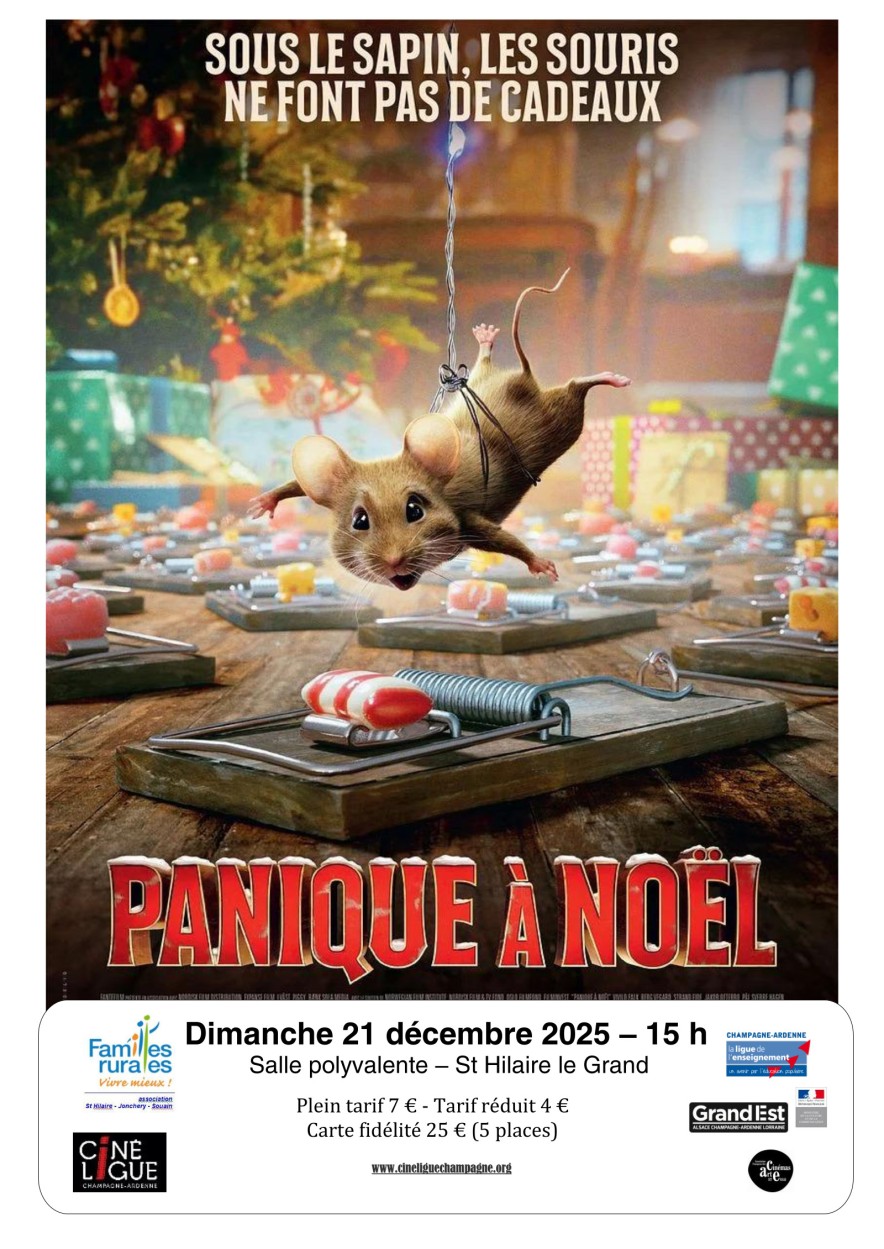 Cinéma : Panique à NoëlFestivités LocalesDimanche 21 Décembre / 15h00 - 16h30![]() Dans la maison des humains décorée pour les fêtes, Noisette, une petite souris aussi maligne que téméraire, rêve de passer un Noël tranquille avec sa famille. Mais quand une invasion de pièges appâtés surgit du jour au lendemain, la paix du foyer vole en éclats : quelqu’un veut manifestement se débarrasser d’elles avant le réveillon ! Décidée à comprendre qui sabote leur Noël, Noisette se lance dans une mission semée d’embûches au milieu des guirlandes, des cadeaux et des dangers mécaniques. Accrochée à un fil, esquivant les pièges les uns après les autres, elle découvre que la véritable menace n’est peut-être pas celle qu’elle croyait… Pour sauver sa famille et rendre au sapin son esprit de magie, Noisette devra faire preuve d’ingéniosité, de courage et… d’un peu de chance. Un film drôle, tendre et rempli de rebondissements, où les souris ne font pas toujours des cadeaux !