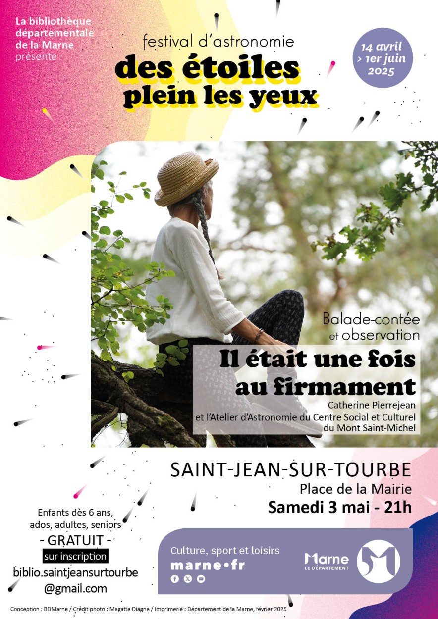 Conte : Il était une fois le firmamentÉvénements CulturelsSamedi 3 Mai / 21h00 - 22h30 Balade nocturne par Catherine Pierrejean, conteuse et passionnée d’astronomie.