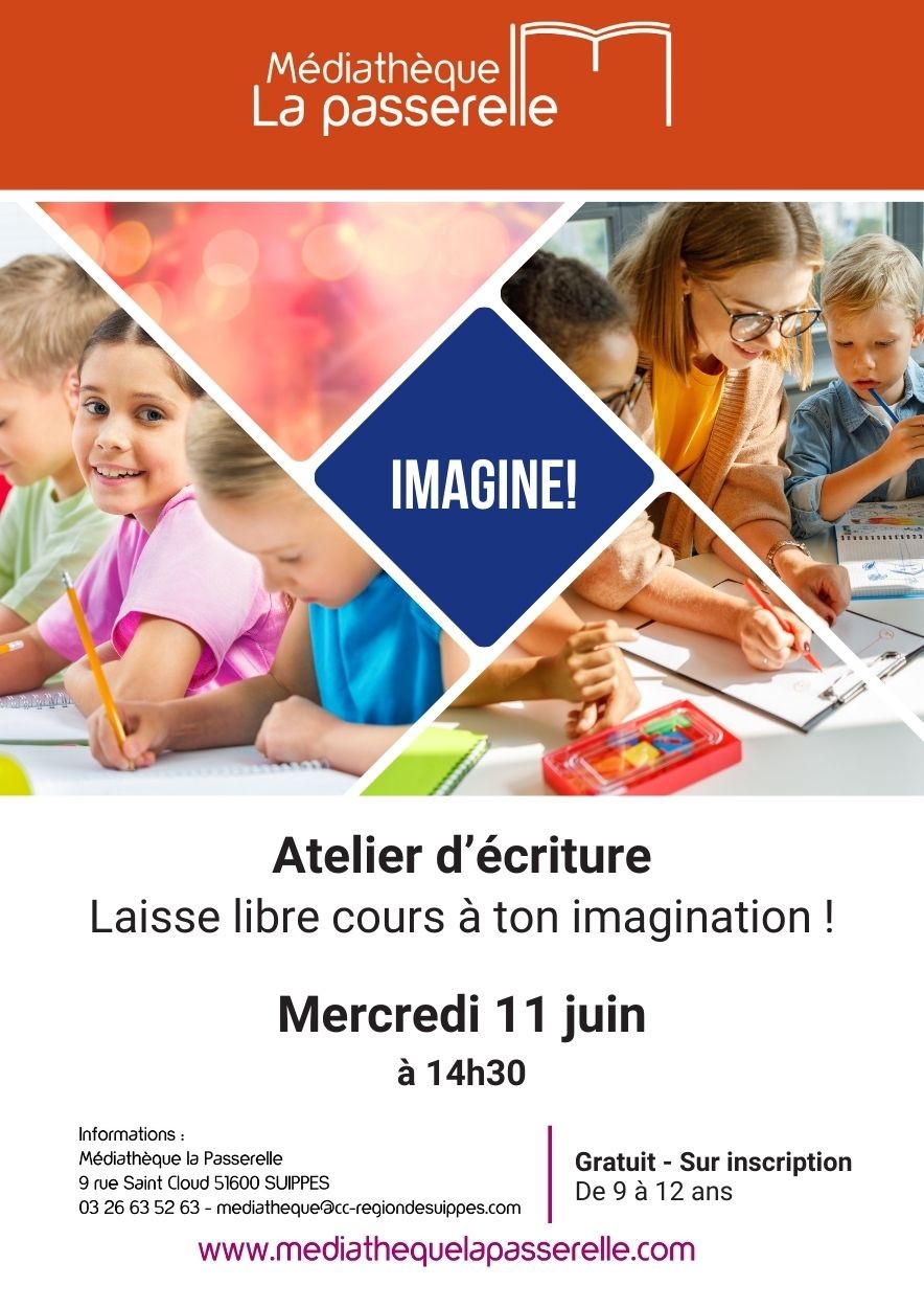 Atelier d'écritureÉvénements CulturelsMercredi 11 Juin / 14h30 - 16h00 Envie de laisser libre cours à ton imagination ?