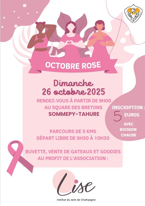 Marche 5 KM au profit de l'Association LiseSports et LoisirsDimanche 26 Octobre / 9h00 - 12h00![]() 💞 Dans la cadre d'octobre rose et au profit de l'Association Lise. L'Institut du Sein de Champagne est une association loi 1901 créée par des professionnels de santé impliqués dans la lutte contre le cancer du sein et soucieux d’organiser et de coordonner le parcours de soins de chaque patiente. Marche de 5 km organisée le dimanche 26 octobre 2025. RDV à la Halle de Sommepy-Tahure, à partir de 9h. Sur place : buvette, vente de gâteaux et goodies.