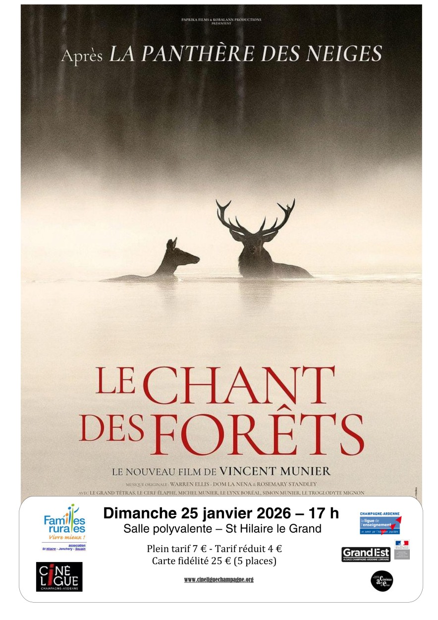 Cinéma : Le Chant des ForêtsFestivités Locales, Nature et EnvironnementDimanche 25 Janvier / 17h00 - 18h30 Au cœur de la taïga sibérienne, l’une des dernières forêts primaires du monde, le photographe animalier Vincent Munier part à la rencontre du vivant invisible. Dans un silence presque sacré, il observe loups, chouettes, cerfs et lynx, non pour les traquer, mais pour apprendre à disparaître à leurs côtés.