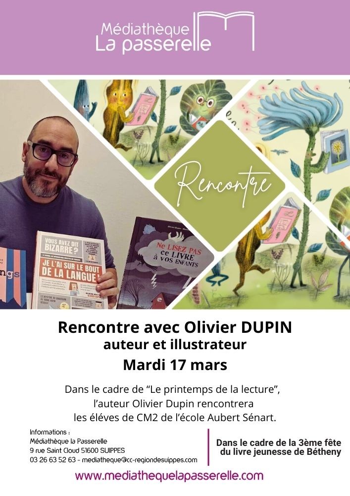 Rencontre Olivier Dupin / École Aubert SénartMédiathèqueMardi 17 Mars / 9h30 - 10h30 SALON DE LITTÉRATURE JEUNESSE, BÉTHENY #