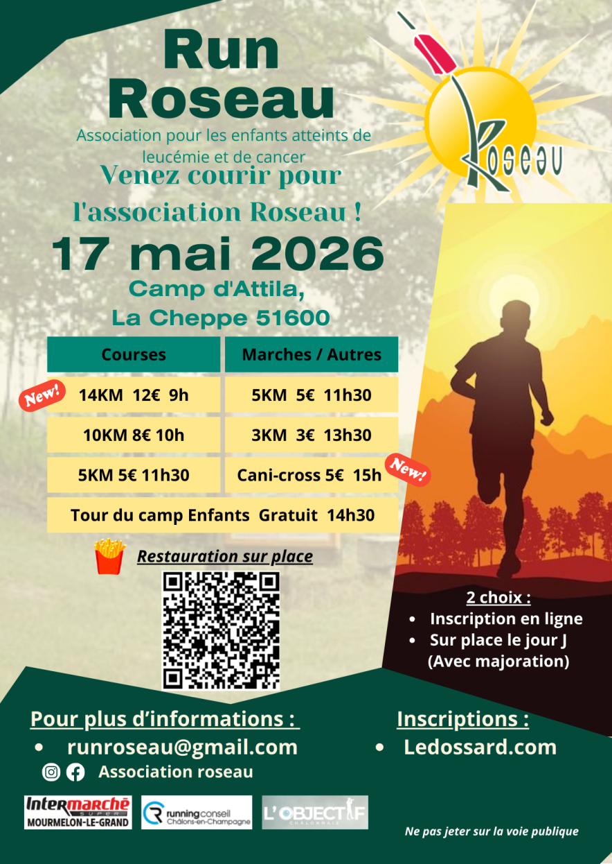 Venez courir pour l'association Roseau !Sports et LoisirsVendredi 17 Avril / 11h30 - 16h00![]() Venez courir au camp d’Attila à La Cheppe contre le cancer des enfants. Inscriptions sur ledossard.com