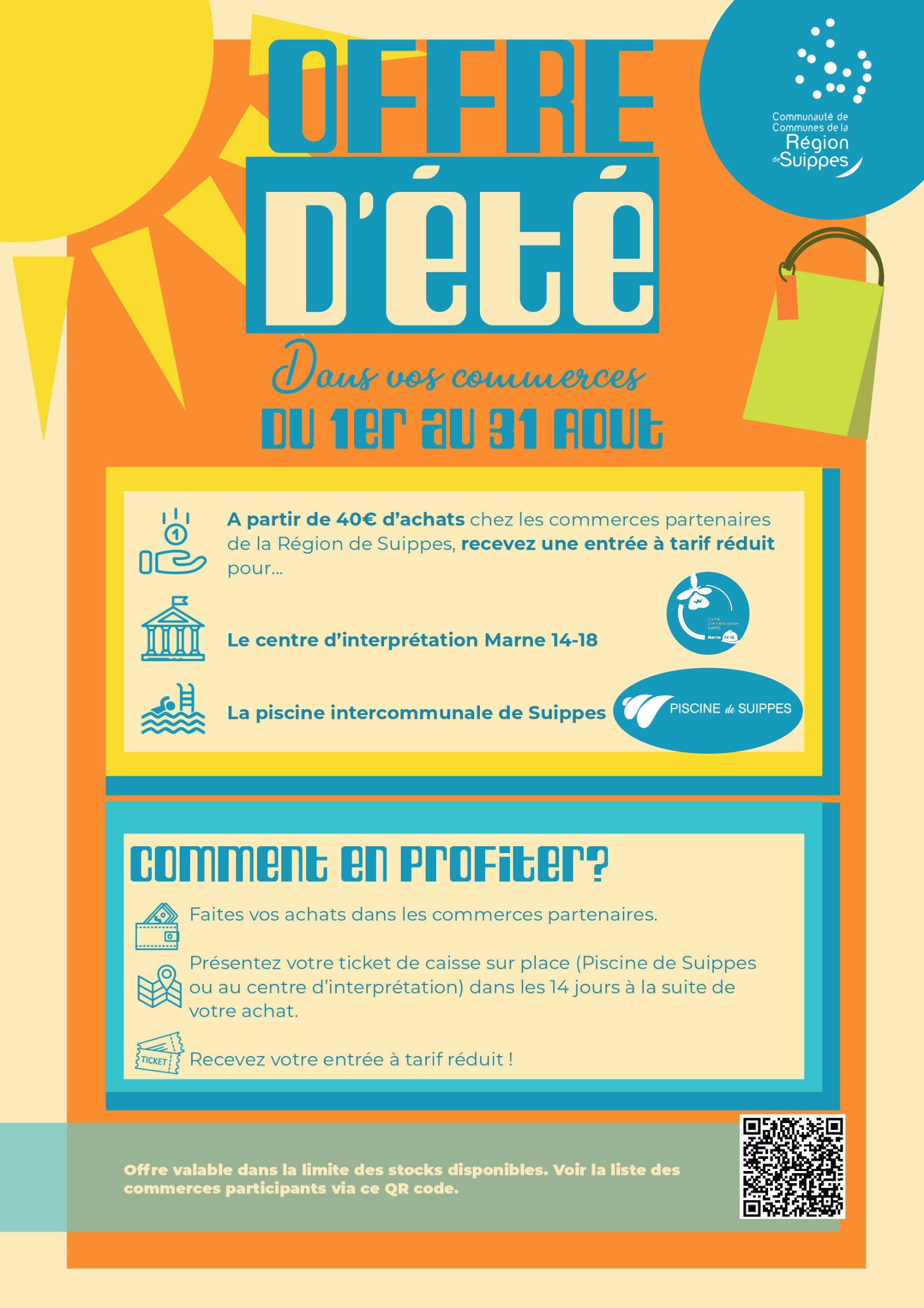 Du 1er au 31 août, pour tout achat de 40€ dans les commerces participants, bénéficiez d'une entrée à tarif réduit à la piscine intercommunale ou au centre d'interprétation Marne 14-18, dans un délai de 14 jours à la suite de votre achat, sur présentation du ticket de caisse.Consultez la liste des commerces participants.